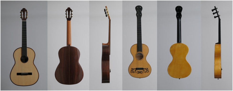 Figure: Classical guitar (left) and terz guitar (right) used in the comparison between the AIR method and the hammer probe